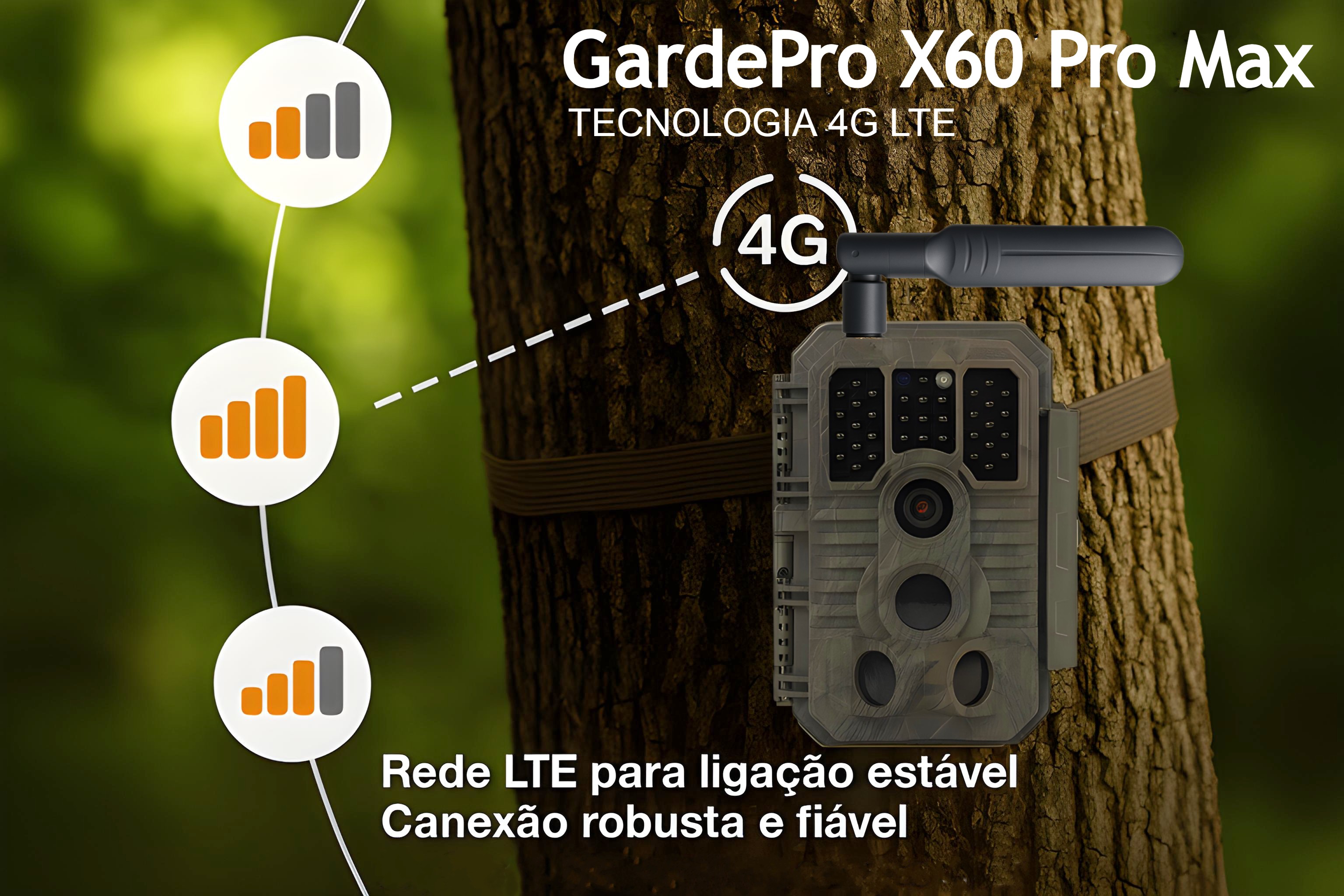• A câmara GardePro X60 Pro Max conta com transmissão em direto e também pode pedir fotos em live. Oferece um desempenho incrível graças à sua tecnologia avançada. A X60 Pro Max conta com memoria interna e não precisa de cartão de memoria, todas as configurações da câmara podem ser ajustadas facilmente através da aplicação móvel. Nesta aplicação, encontrará um conjunto de ferramentas avançadas que permitem controlar e modificar todas as configurações da câmara de forma conveniente. Com a inclusão de um cartão LTE e os melhores planos disponíveis, pode visualizar as fotos e escolher o cartão que melhor atende às suas necessidades. A rede LTE oferece uma conexão robusta e fiável, garantindo a fiabilidade da câmara em todos os momentos.