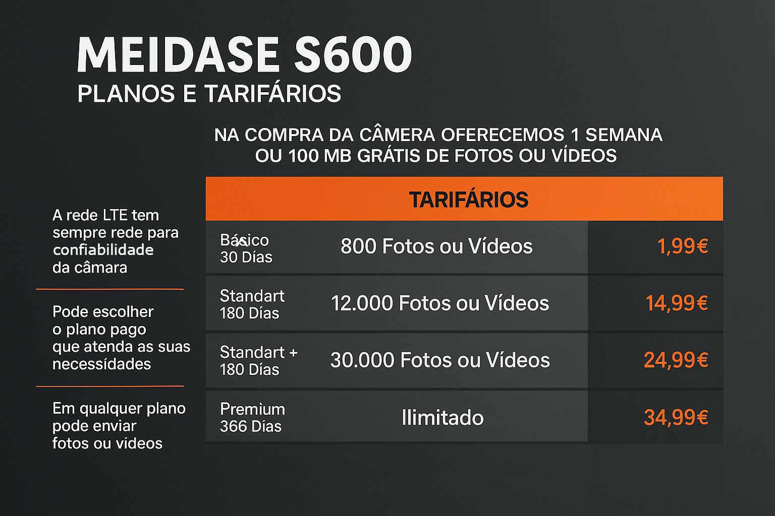 • A câmera Meidase, oferece uma performance incrível de tecnologia avançada. Todas as configurações da câmara podem ser modificadas através da aplicação no telemóvel. Na aplicação no telemóvel têm um conjunto de ferramentas avançadas que permite controlar e modificar todas as configurações da câmara. Esta câmera destaca-se porque envia vídeos e têm sempre rede em qualquer zona. Com cartão LTE e os melhores planos disponíveis, você pode ver nas fotos e escolher o cartão que melhor atende às suas necessidades. A rede LTE oferece uma conexão robusta e confiável para garantir a confiabilidade da câmera em todos os momentos.