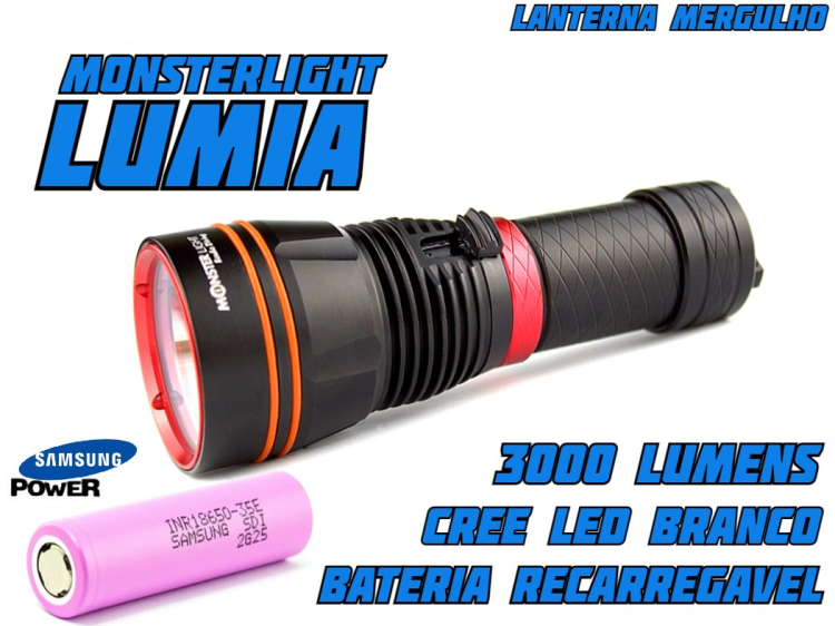 Kit lanterna mergulho MonsterLight Lumia com bateria recarregável Samsung