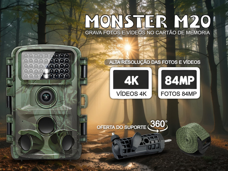 • Apresentamos a Câmara Monster M20 4K, uma câmara de alta definição concebida para capturar cada detalhe com máxima nitidez e rapidez. Com um tempo de disparo ultrarrápido de apenas 0,2 segundos, a M20 garante que nenhum movimento passa despercebido, seja durante o dia ou na escuridão da noite. Graças ao seu alcance de até 25 metros, esta câmara capta imagens e vídeos nítidos e cheios de cor, tornando-se uma ferramenta essencial para detecção de caça, observação de vida selvagem ou vigilância rural e florestal. Versátil e discreta, a Monster M20 4K pode ser instalada praticamente em qualquer lugar, em árvores, postes, paredes ou rochas, proporcionando monitorização eficaz e segura em qualquer ambiente.