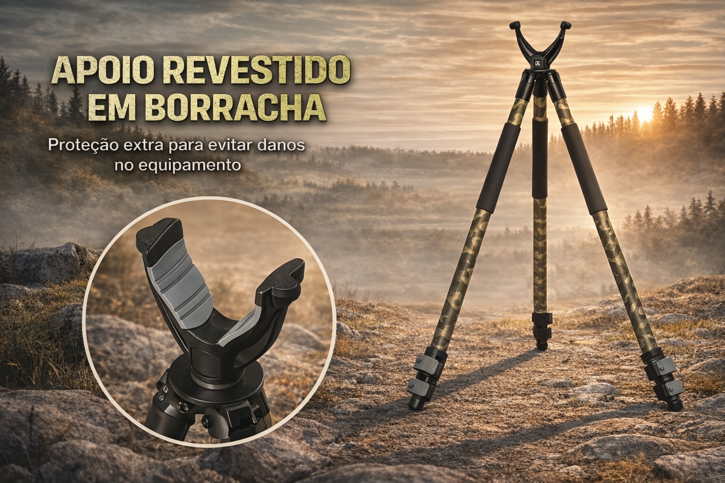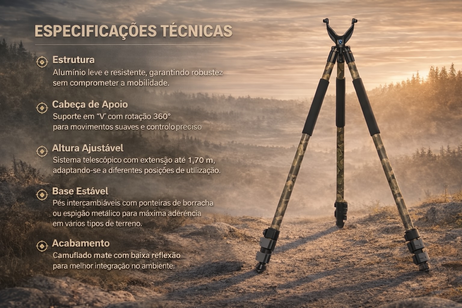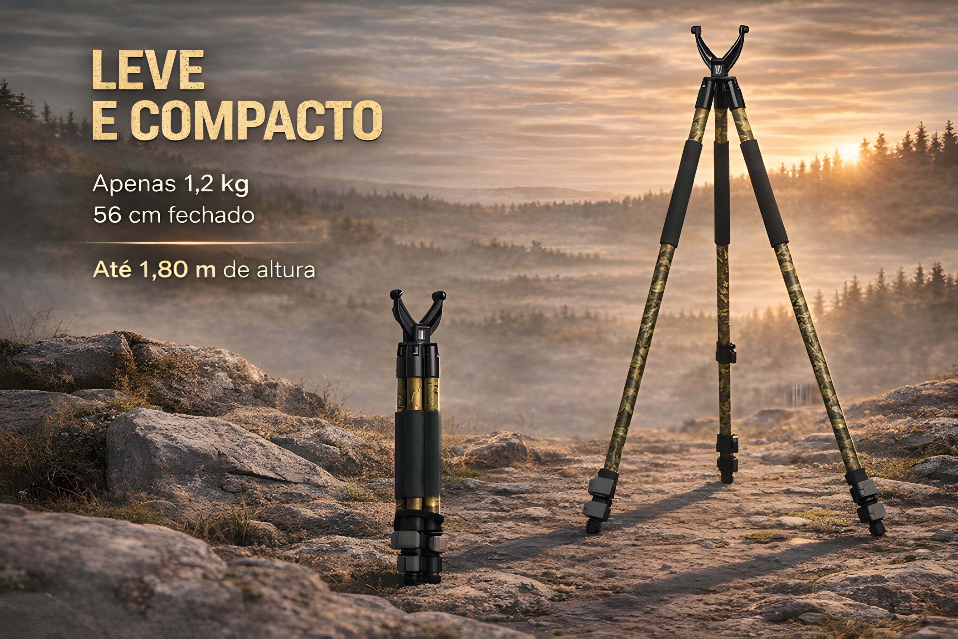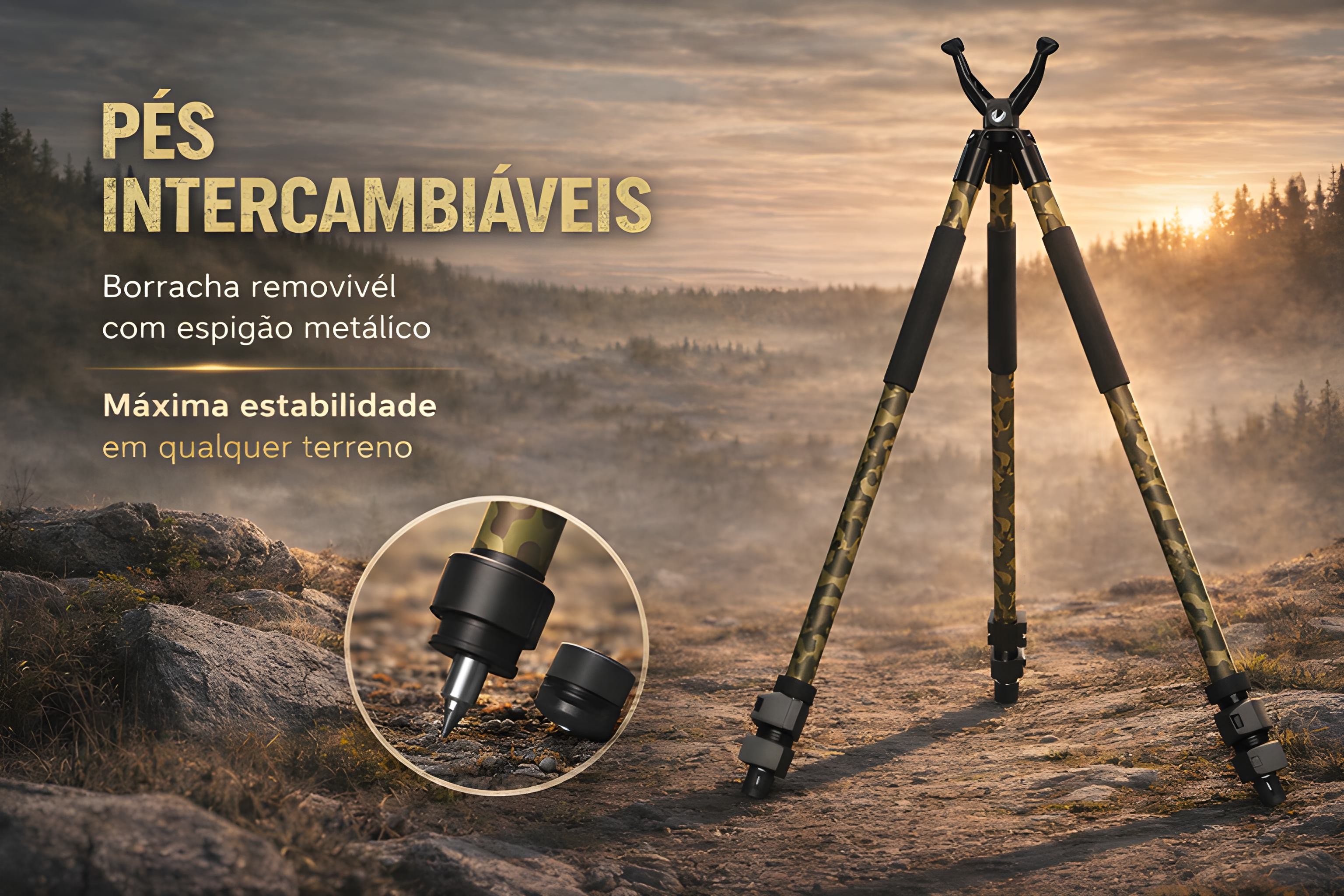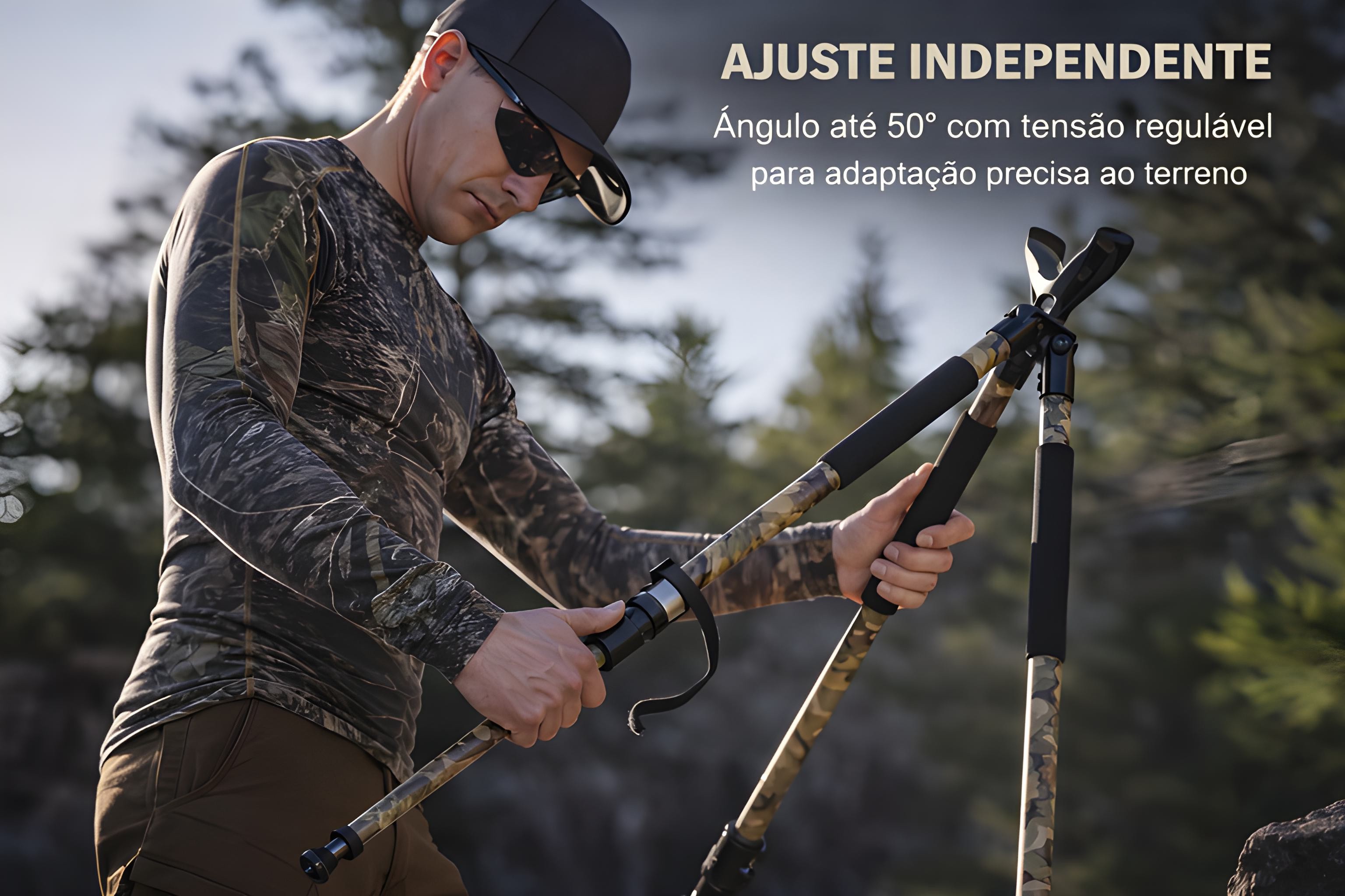 • Apresentamos o novo tripé Monsterlight Trakiom Camuflado, leve, estável e seguro. As suas pernas de três secções em material de alta resistência, com acabamento camuflado mate, garantem durabilidade e discrição. Cada perna pode ser ajustada de forma independente num ângulo de até 50°, com tensão regulável, permitindo disparar praticamente qualquer posição. Os pés de borracha removíveis podem ser desenroscados para revelar espigões metálicos, assegurando uma aderência firme em qualquer tipo de terreno.