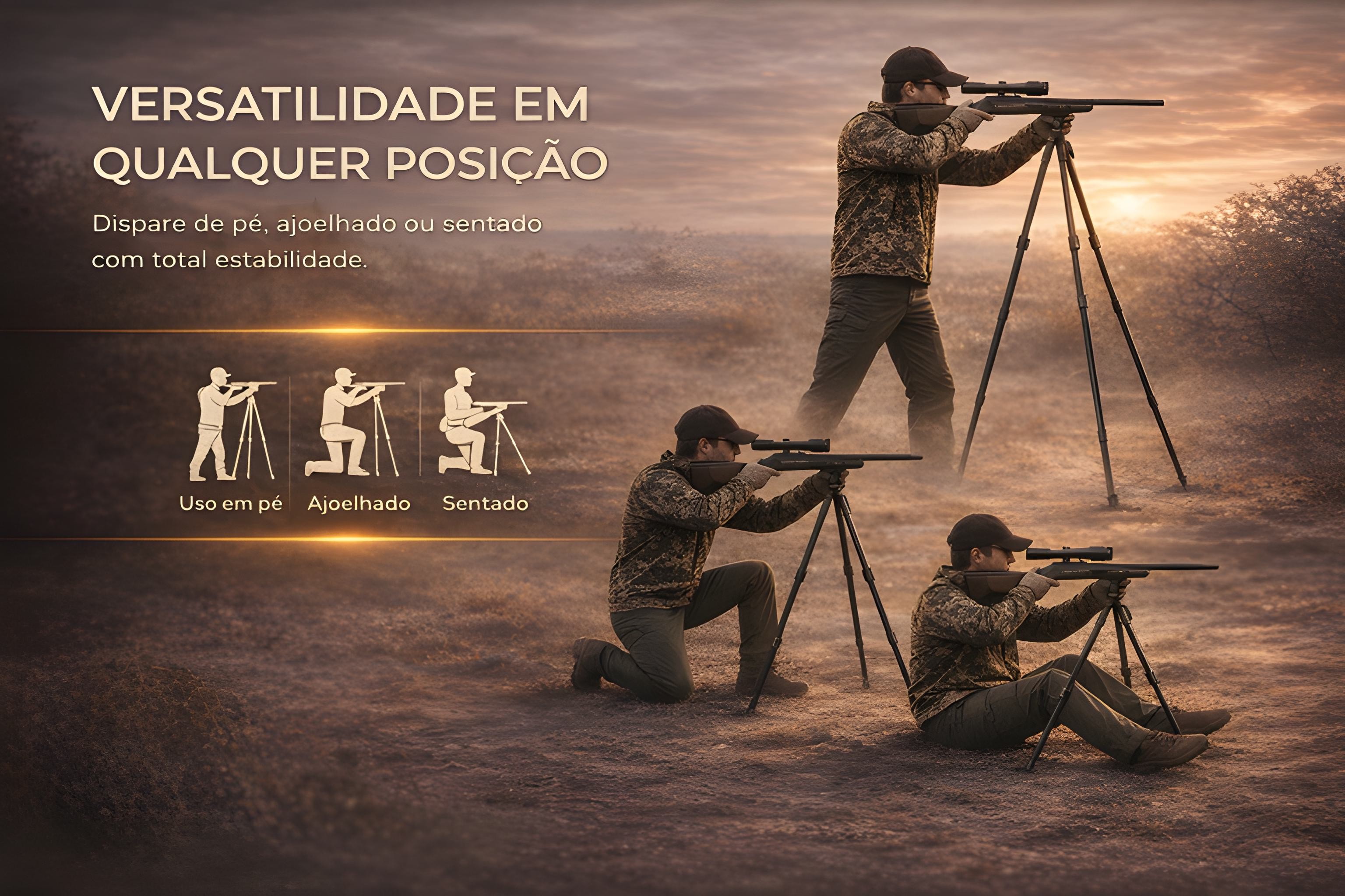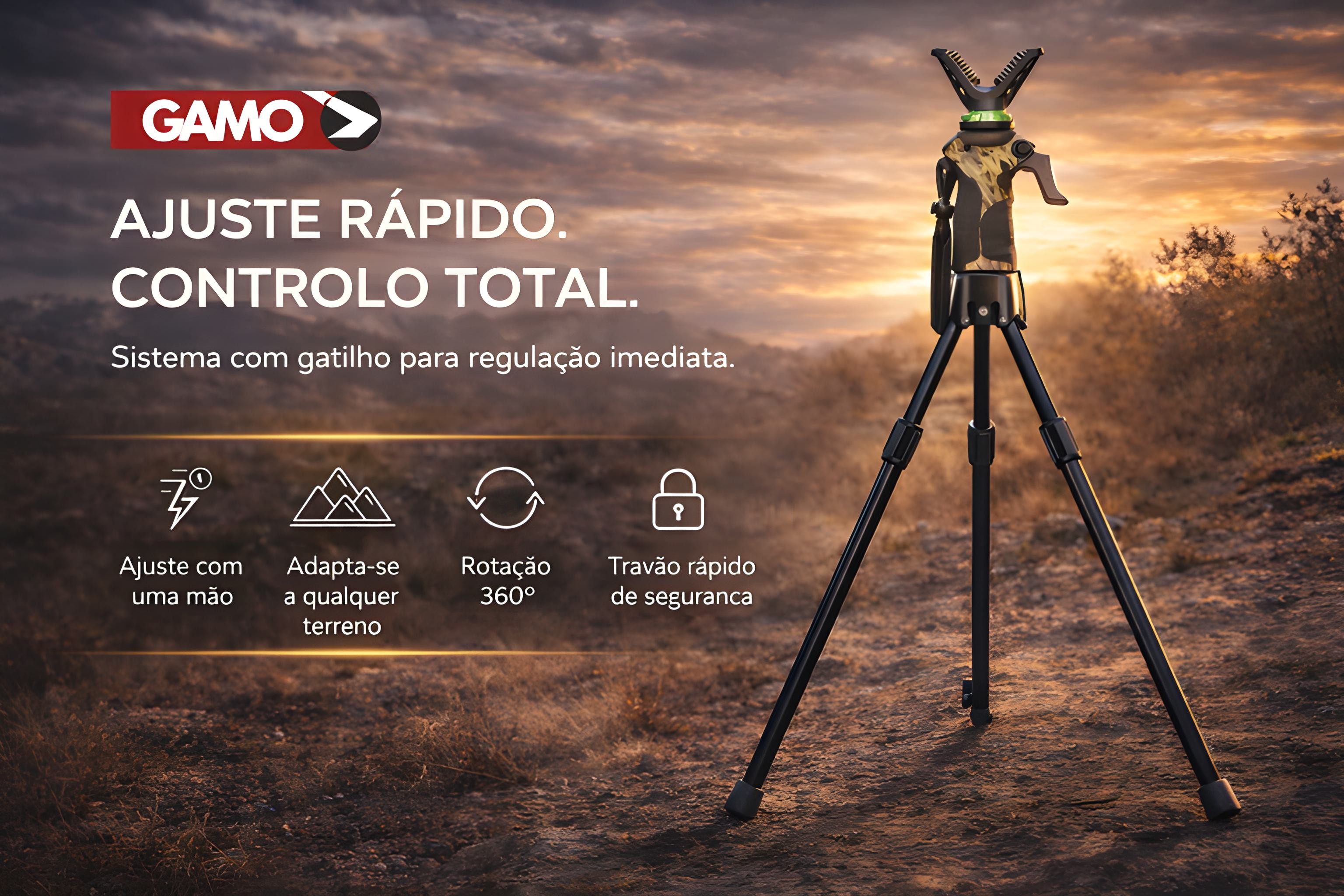 • Tripé com forquilha e cabo giratório de 360º, garante maior conforto no disparo mesmo em qualquer terreno. O tripé Gamo Gen3, ajusta-se à altura com apenas uma mão, sistema de montagem e desmontagem rápida com travão integrado, é adaptável a qualquer terreno ou posição, em pé, sentado ou ajoelhado. Mantenha sempre a posição travada para garantir que a arma ou a óptica estejam seguras. Punho e pega antiderrapantes para evitar escorregar. Junta rotativa reforçada para um deslizamento mais suave.