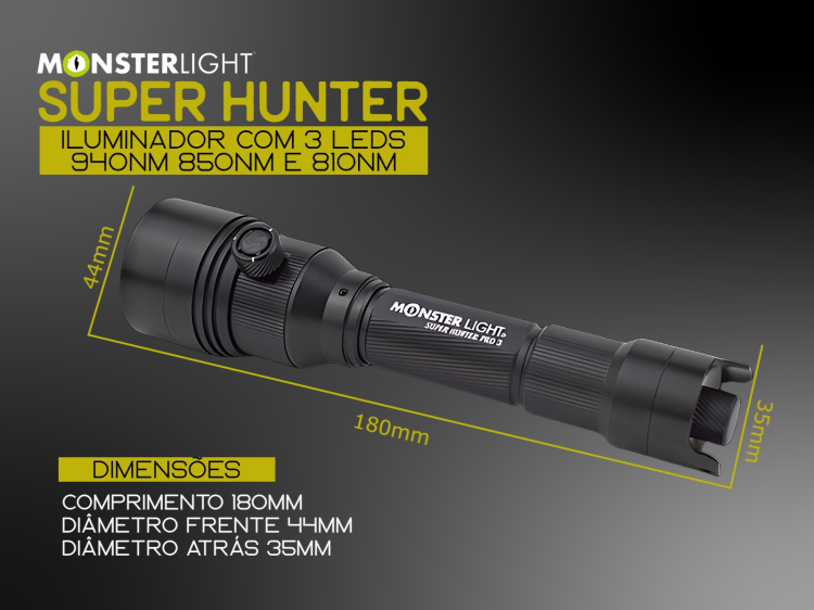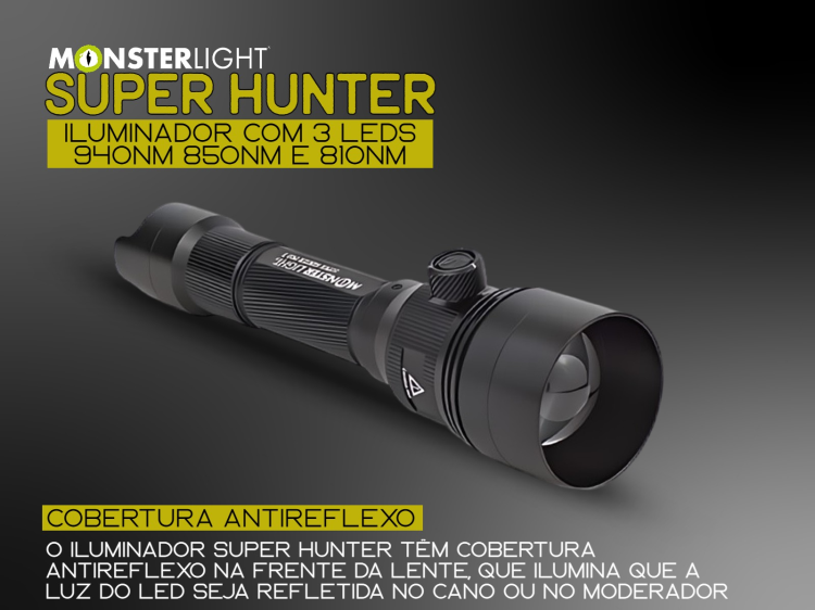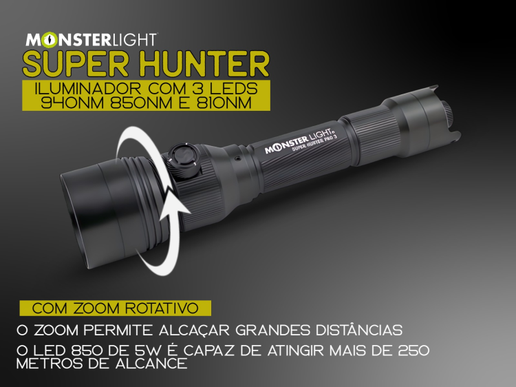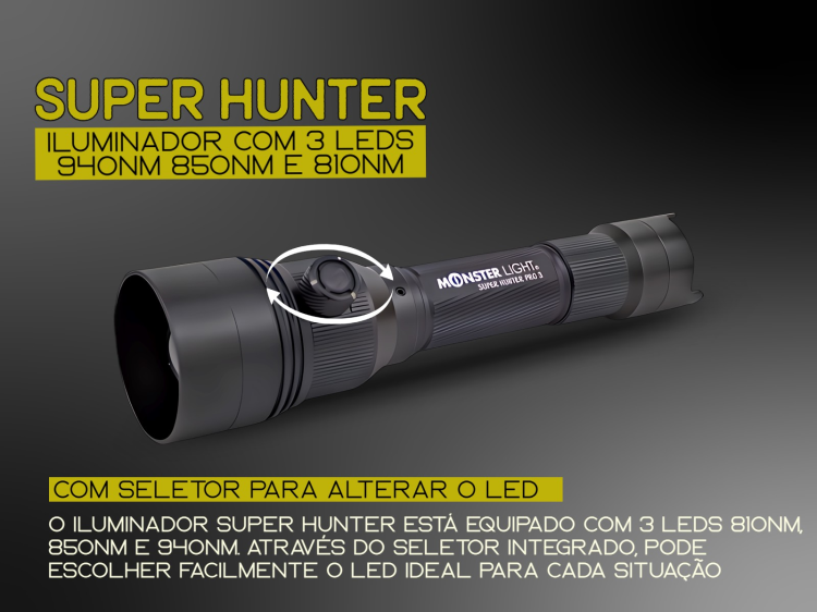 • O MonsterLight Super é um iluminador de alta performance, desenvolvido para quem procura potência, versatilidade e qualidade de imagem superior. Com a sua lente esférica de 44mm com zoom, garante iluminação precisa e ajustável a diferentes distâncias. O Super Hunter destaca-se dos restantes iluminadores por integrar 3 LEDs OSRAM (810nm, 850nm e 940nm), facilmente selecionáveis através de uma patilha prática na cabeça do iluminador, simples, rápido e eficaz