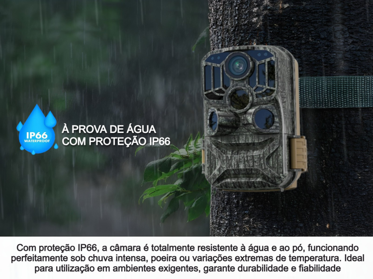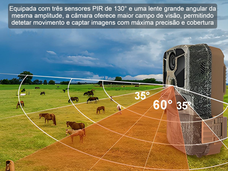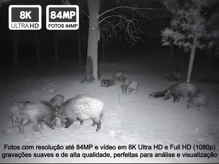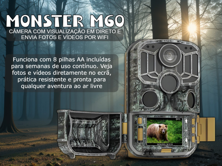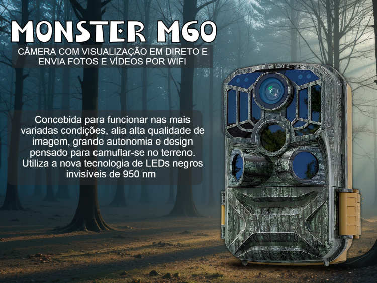 • A Monster M60 traz a combinação perfeita entre tecnologia, praticidade e desempenho. Com Wi-Fi e Bluetooth integrados, você pode ver tudo em tempo real diretamente no seu smartphone. Controle facilmente todas as funções pelo aplicativo gratuito para iPhone e Android, visualize fotos, assista vídeos e ajuste configurações em segundos. Diga adeus à troca constante de cartões SD! Com antena interna e alcance Wi-Fi de até 50 metros, ela garante uma conexão estável e confiável. Agora equipada com nova tecnologia de LEDs infravermelhos 950 nm, a Monster M60 oferece imagens e vídeos ainda mais nítidos, mesmo em ambientes com pouca luz. O flash invisível garante discrição total durante o uso noturno, sem assustar animais ou chamar atenção. Instale facilmente em árvores, cercas ou locais de difícil acesso e desfrute de uma experiência completa com imagens de alta qualidade, tecnologia avançada e autonomia impressionante.