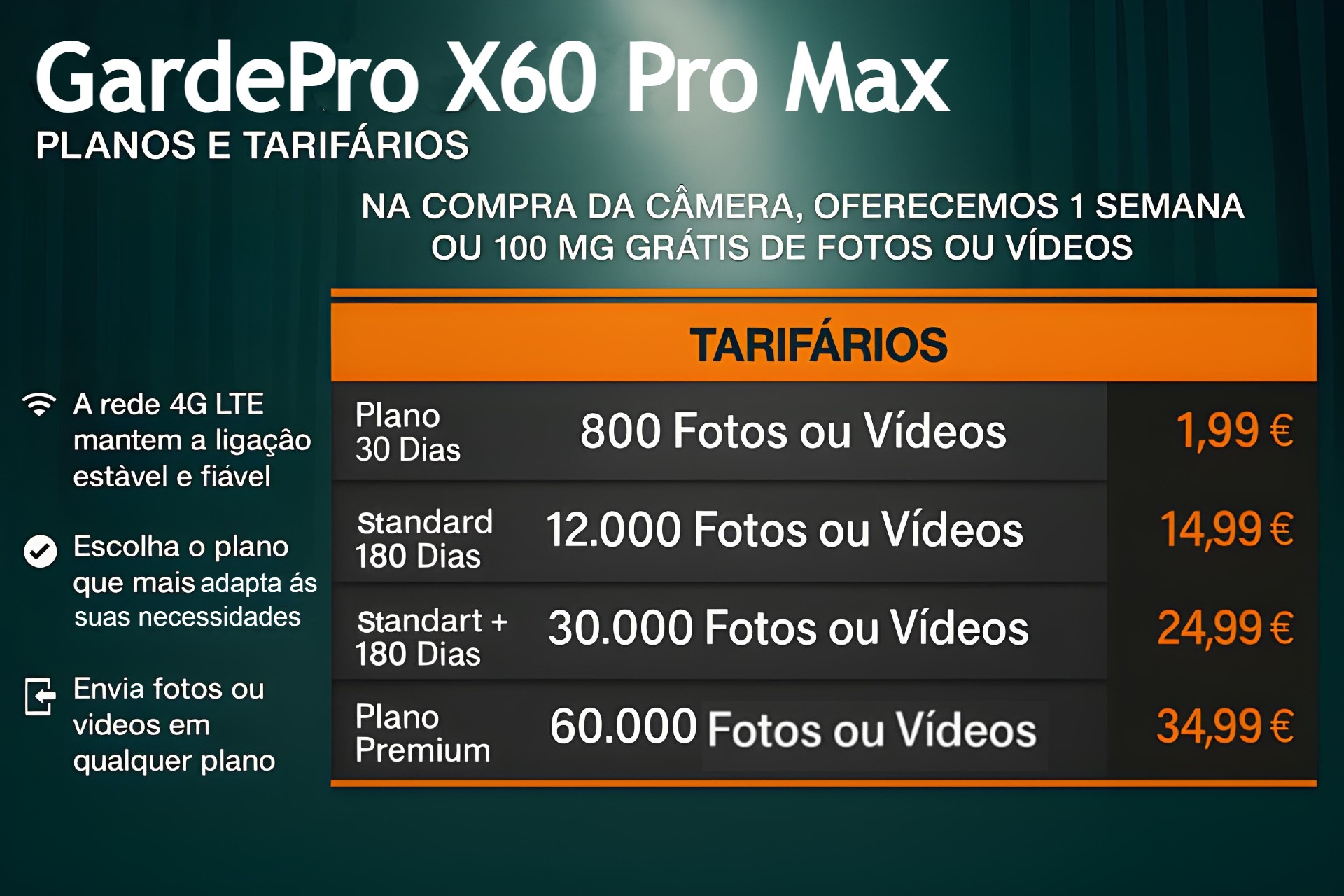 • A câmara GardePro X60 Pro Max conta com transmissão em direto e também pode pedir fotos em live. Oferece um desempenho incrível graças à sua tecnologia avançada. A X60 Pro Max conta com memoria interna e não precisa de cartão de memoria, todas as configurações da câmara podem ser ajustadas facilmente através da aplicação móvel. Nesta aplicação, encontrará um conjunto de ferramentas avançadas que permitem controlar e modificar todas as configurações da câmara de forma conveniente. Com a inclusão de um cartão LTE e os melhores planos disponíveis, pode visualizar as fotos e escolher o cartão que melhor atende às suas necessidades. A rede LTE oferece uma conexão robusta e fiável, garantindo a fiabilidade da câmara em todos os momentos.