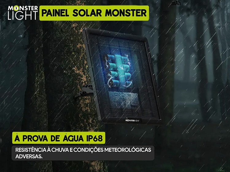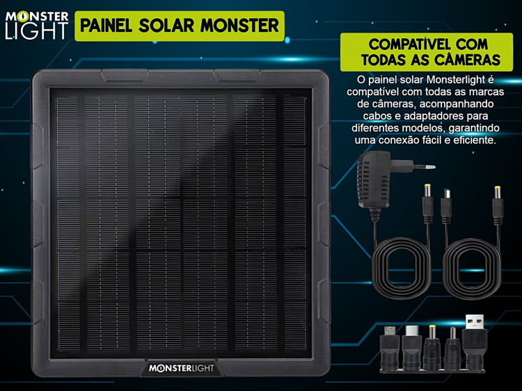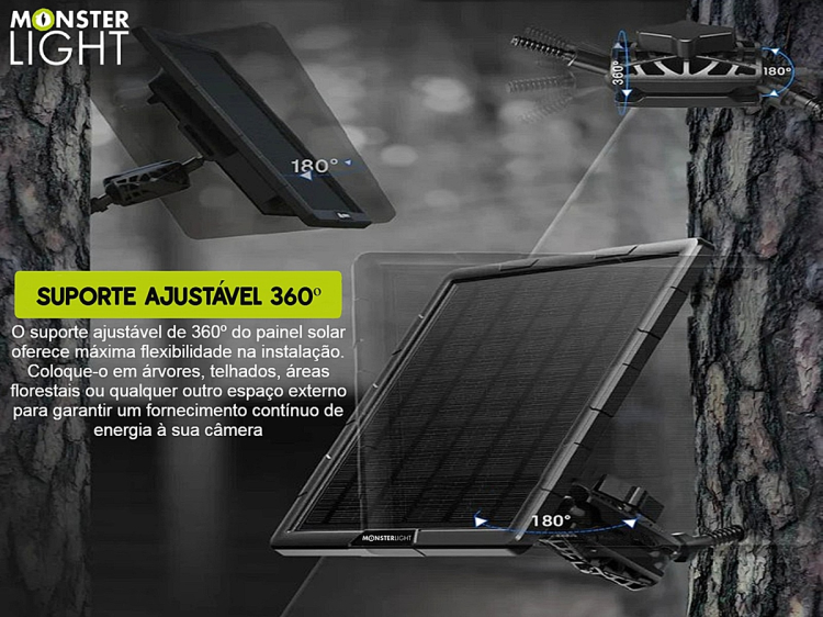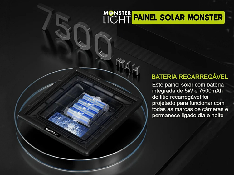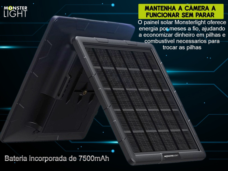 • O painel solar Monsterlight, com bateria de lítio de 7500mAh e 5 watts, assegura um fornecimento contínuo de energia para todas as câmaras. Combinando a durabilidade e fiabilidade da bateria de lítio com a energia regenerativa do sol, o painel solar mantém as suas câmaras a funcionar durante toda a temporada e muito mais. Assim poupa dinheiro em pilhas e em deslocações para trocar as mesmas, é compatível com todas as câmaras.